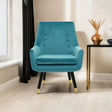 This chair in green velvet upholstery adds character to an array of styles. Boasting button tufting, the cosy armrests and foam padded seat of this chair provides comfort, and the slanted wooden legs in the black finish contribute to the mid-century modern era.