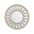 The round central mirror has a light-reflecting convex design that evokes the cup of a flower. A carved inner border surrounds the mirror, from which the oval petals bloom outwards towards the exterior rim. Its subtle gold colour is enhanced by gentle weathering. Display it with boutique hotel furniture and accessories.