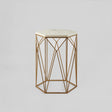 Its base is crafted from strong iron and has a warm gold finish. The iron is very slightly distressed for a textured look, its hexagonal top is made from solid marble, and has a white colour flecked with darker wisps and veins. It styles well with luxe furniture and accessories