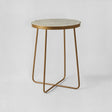Its base is crafted from strong iron and has a warm gold slightly distressed texture, the legs intersect at the base to produce a flowing silhouette , its round top is made from solid marble, and has a white colour flecked with darker wisps and veins. It styles well with luxe furniture and accessories