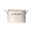 The Sketch cutlery caddy has four compartments designed to keep forks, knives and spoons separated. It's made from tough metal and has a hard-wearing enamel coating. Looped metal handles at each side make it easy to carry, while ribbed detail on its lower half give it a textured look. It boasts a gentle cream finish, with grainy black utensils lettering in bold font.