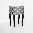 The cabinet is fronted with smoked coloured glass set in a 3D formation that adds to its reflective appeal. A pair of drawers are decorated with cut glass handles, and cabriole legs add a hint of elegance.