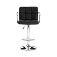 The Starz bar chair is upholstered in soft black faux leather. Its quilted seat and backrest are enhanced by fine stitching, with a matching faux leather trim covering each chrome armrest. A footrest projects from the reflective chrome stand, while an easy-to-reach handle below the seat allows for height adjustment.