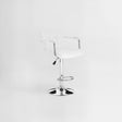 The Starz bar chair is upholstered in soft white faux leather. Its quilted seat and backrest are enhanced by fine stitching, with a matching faux leather trim covering each chrome armrest. A footrest projects from the reflective chrome stand, while an easy-to-reach handle below the seat allows for height adjustment.