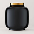 Crafted by skilled artisans, this contemporary black porcelain features angular shoulder and a sleek lip accented in a warm metallic finish. The two tonal contrast in smooth glazed finish will lend style and sophistication to boutique hotel decors.