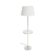 This contemporary floor lamp has a slender metal rod, supported by a round metallic base in a reflective chrome finish. A matte white finish tray in the middle adds a classic elegance to its striking finish. The white fabric tapered shade has a matching tray, making this floor lamp a functional and fashionable addition to a variety of interior settings.