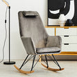 Upholstered in grey velvet, this high-back rocking chair showcases a clean profile, supported by a black-finish metal frame. The comfortable cushioning and a pillow on top offer a plush seating experience. A durable metal frame offers stability to the chair, and a pair of beechwood rocker rails gives an ease for maneuvering. This modern chair is a perfect addition to a variety of interior settings.