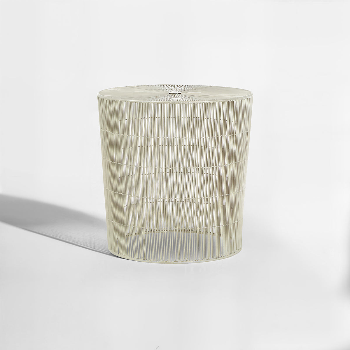 The iron strips that comprise its top section emerge from a central plate, with intersecting lines that produce a concentric circle pattern. Its sides follow a similar arrangement, combining to give the table a light and airy aesthetic.