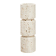 The Tibor large candle holder is crafted from travertine featuring a stacked design in natural shades of white, tan, cream, and rusty varieties.