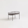 This minimalist modern oval-shaped table will create a chic focal point in your living room. The unique design of this elegant table features a round grey tempered glass top encased in a slightly hollowed frame. The lower shelf of this table is made from solid metal that goes well with sleek and sturdy black finish metal frame, making it ideal for contemporary and modern spaces.