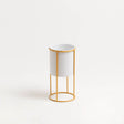 This small dual-toned floor standing planter will bleed elegance and a luxurious feel in your living spaces. The crisp white round shaped planter is an ideal platform for adding a verdant green plant to your decor settings. The planter is situated inside a four column round metal stand with warm gold finish, countering the planter gracefully and offering a timeless regal look to your space.
