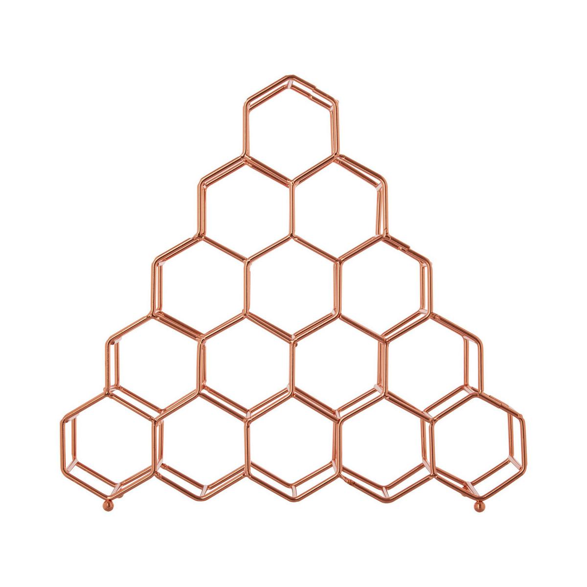 Made from sleek yet sturdy metal wires, this spice rack features 15 hexagonal sections which combine to form a honeycomb pattern. The geometric rack is finished in copper effect which lends it a luxe visual accent while contributing to the decorative appeal. Each angled space is designed to hold a standard-sized spice jar.