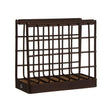 Its wireframe is made from rust-resistant iron and features a powder coated finish for added durability. A rectangular piece of rubberwood is set into the holder's thick base, overlain by horizontal strips of iron. The holder's design allows a stack of napkins to be neatly folded between its sides.