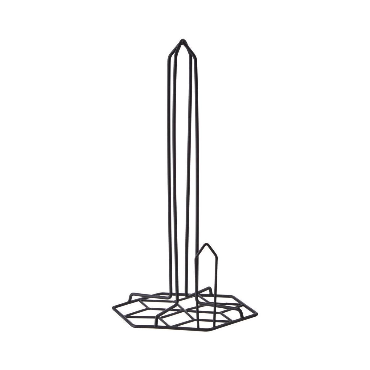 Crafted from metal wire, the Vertex Contour matte black finish kitchen roll holder ascends vertically from a geometric style base. The front brace raised parallel on its outer edge keeps the paper roll in place.