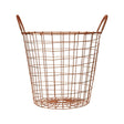 This contemporary basket is crafted from has a sleek copper finish that lends it a warm metallic look. Featuring a wide rim, it sports a tapered design and has an arcing handle at each side for easy lifting. It's made from strong iron and has a wireframe design, perfect for coordinating with geometric-style accessories.