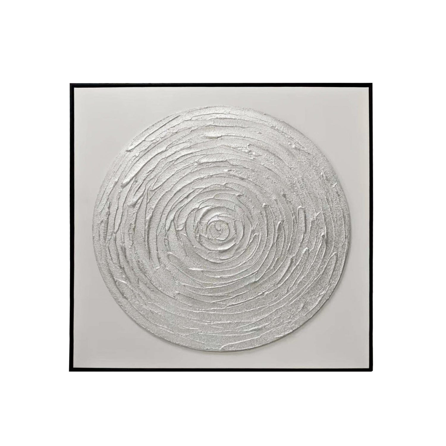 Featuring a raised, spiral-textured silver circle on a clean white background, this piece adds depth and a modern touch.