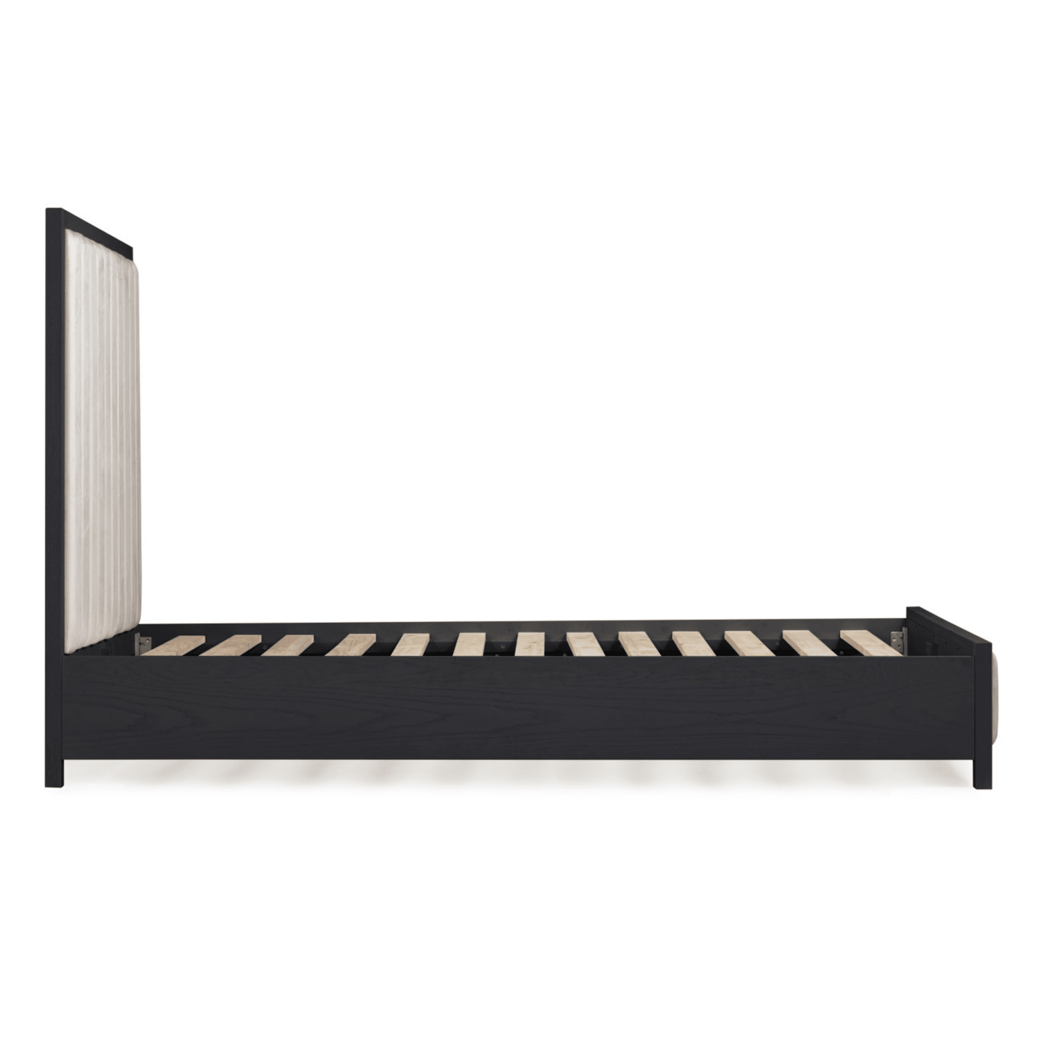 This statement piece features a soft cream velvet headboard and footboard, framed in a bold black wooden finish for striking contrast.