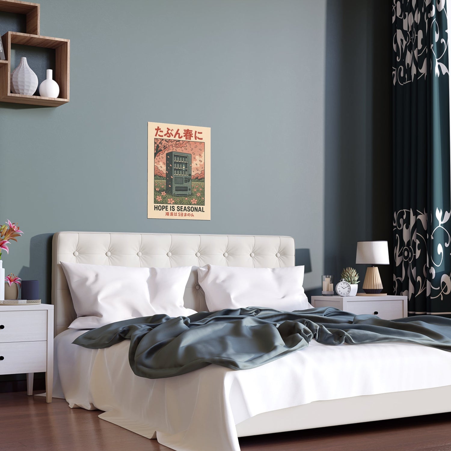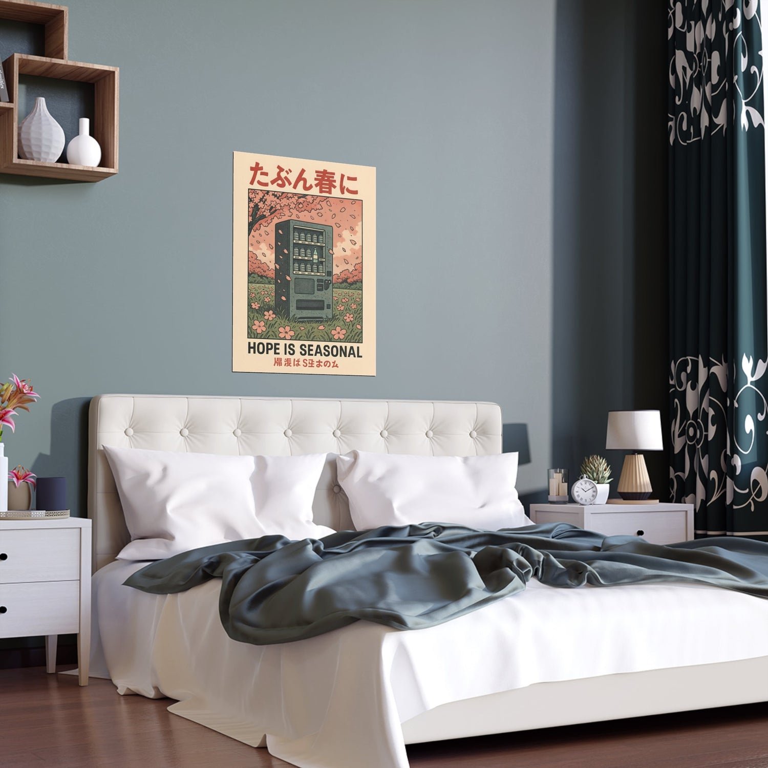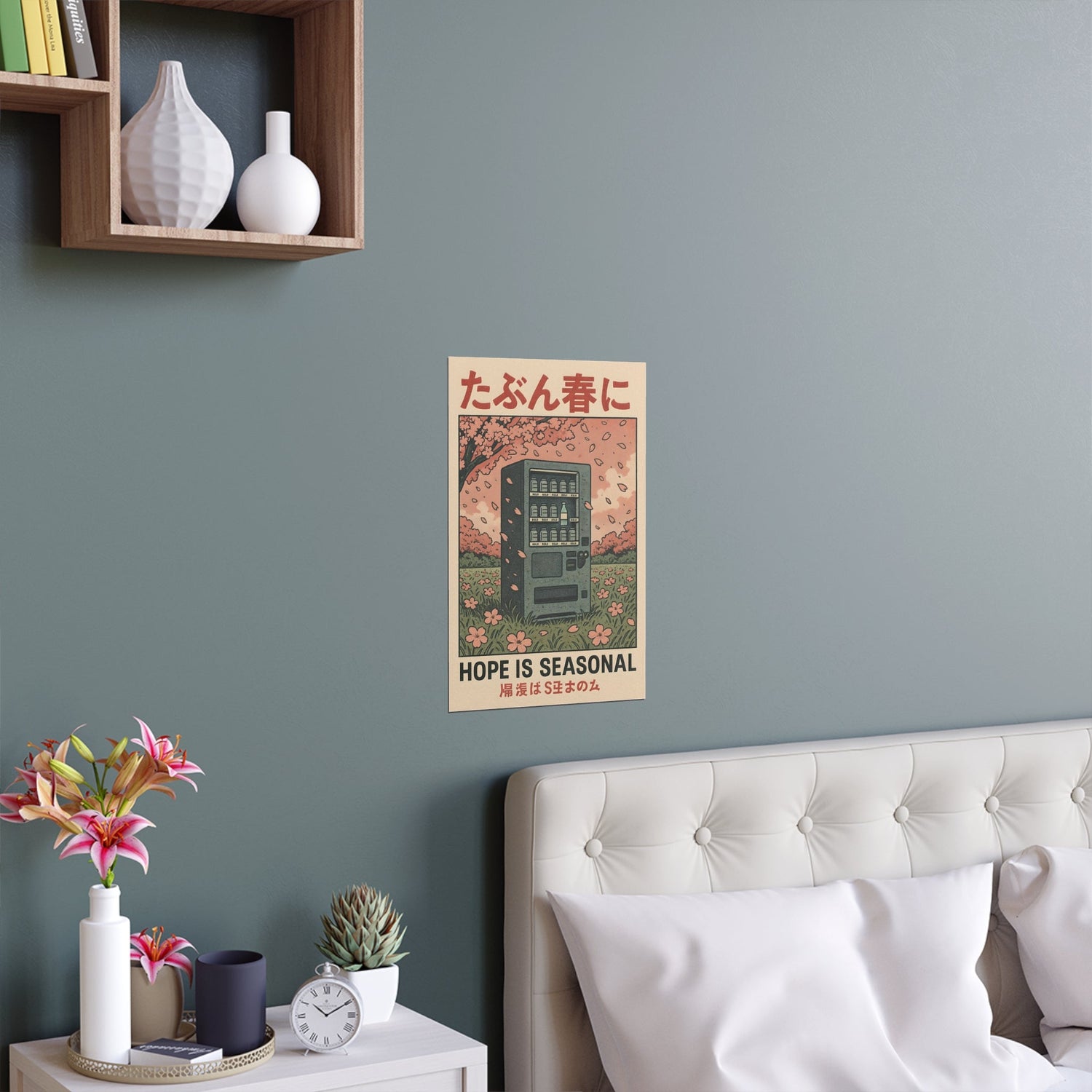 A poignant blend of melancholy and charm, this print features a lone vending machine beneath blooming cherry blossoms—offering a quiet reflection on fleeting optimism. A thoughtful piece that captures the beauty in transience.