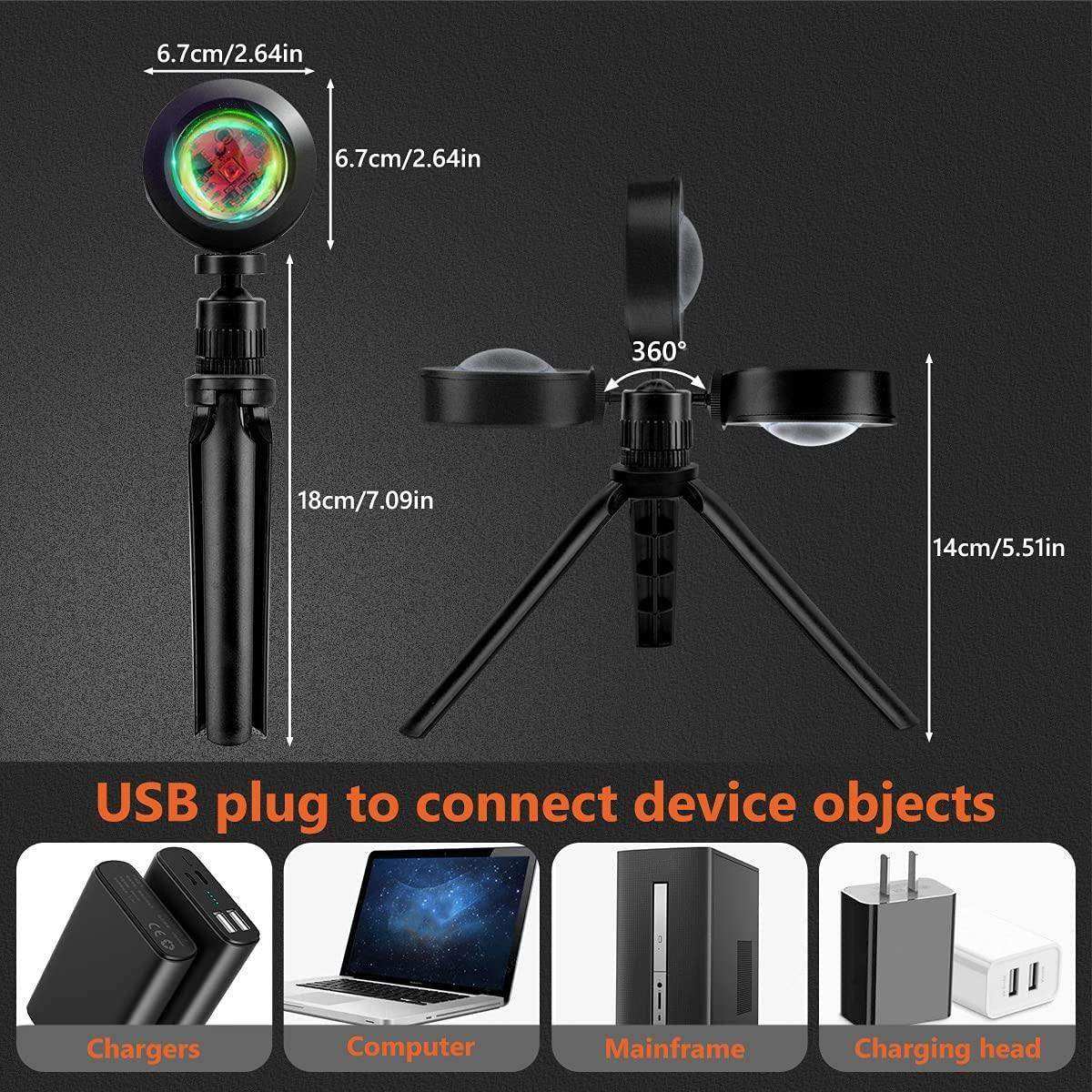 The Sunset Glow lamp included a fully adjustable tripod which can turn 360° to the left & right and 180° up & down to allow you to perfectly position & angle your sunset projection however you wish.