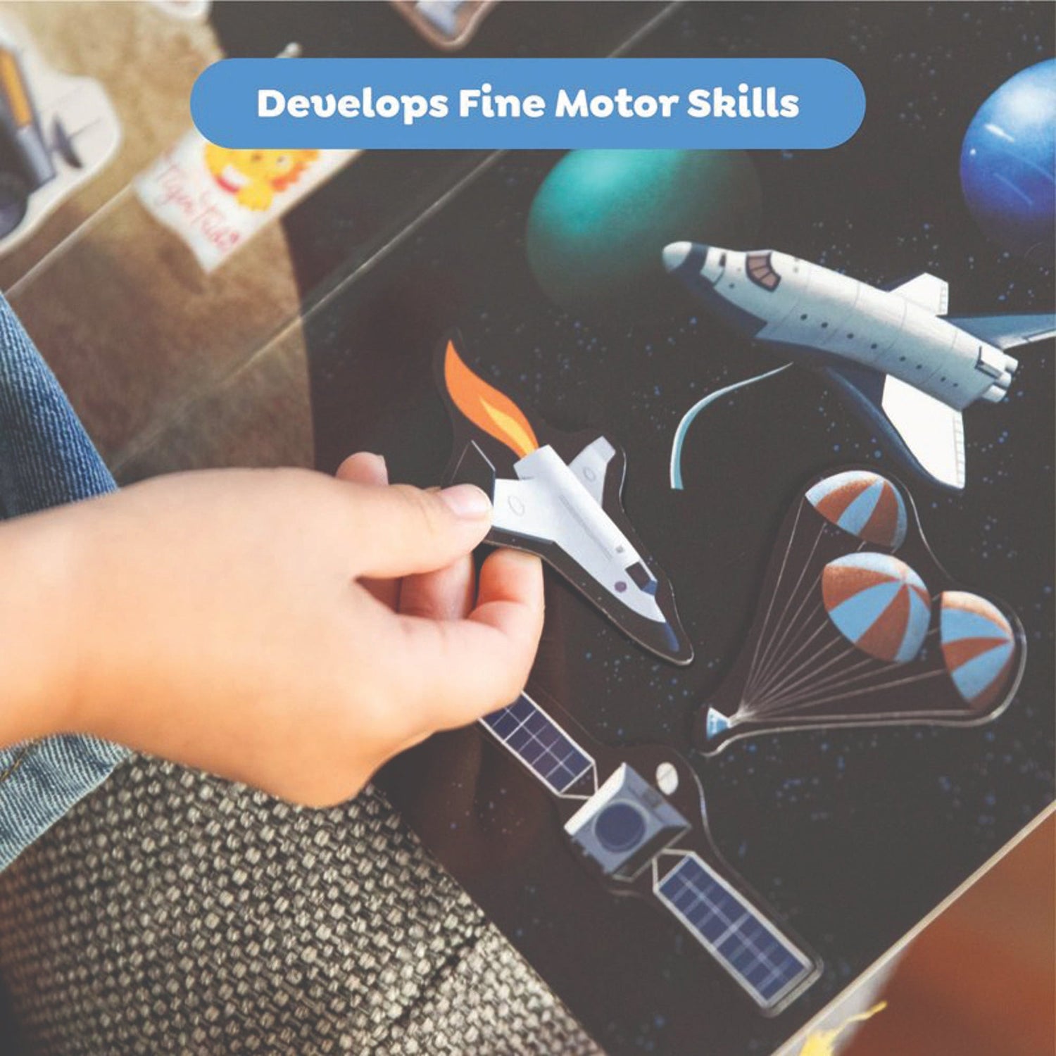 With this magnetic board for kids, you can boldly go on a journey to the moon. Fly your rocket across the universe or go on a gravity walk across the planets! Create a new play scene every time! When finished, packing up is lots of fun with the 'match the magnet pieces' puzzle that kids can find on the case.