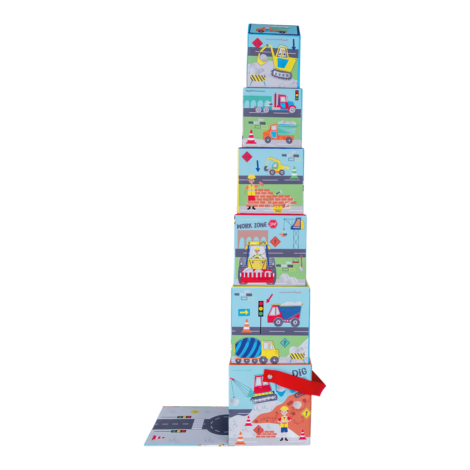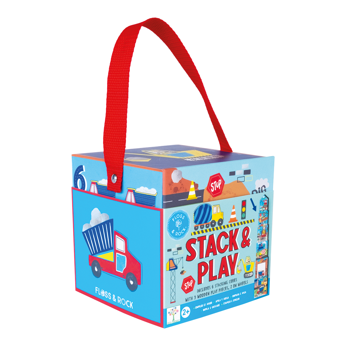 Get ready for endless amounts of fun with Stack & Play. Make a tower, then hide and play using the wooden pieces. Count the numbers on one side, then match up the scenes on the other (either by stacking or laying them side by side). The cool Construction design features diggers, trucks, cement mixers and more. Stack & Play includes 6 stacking cubes, 3 wooden play pieces, 2 on wheels. All parts are stored in the biggest box with a handy carry handle, making it so easy to take around with you!
