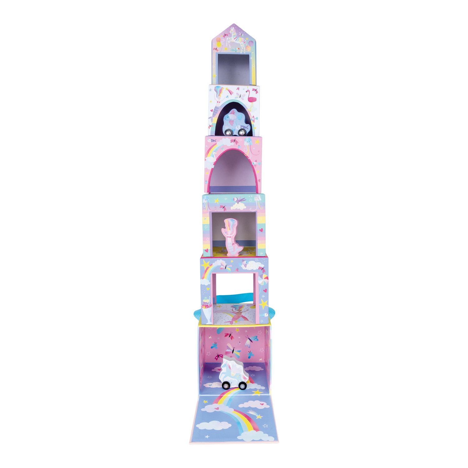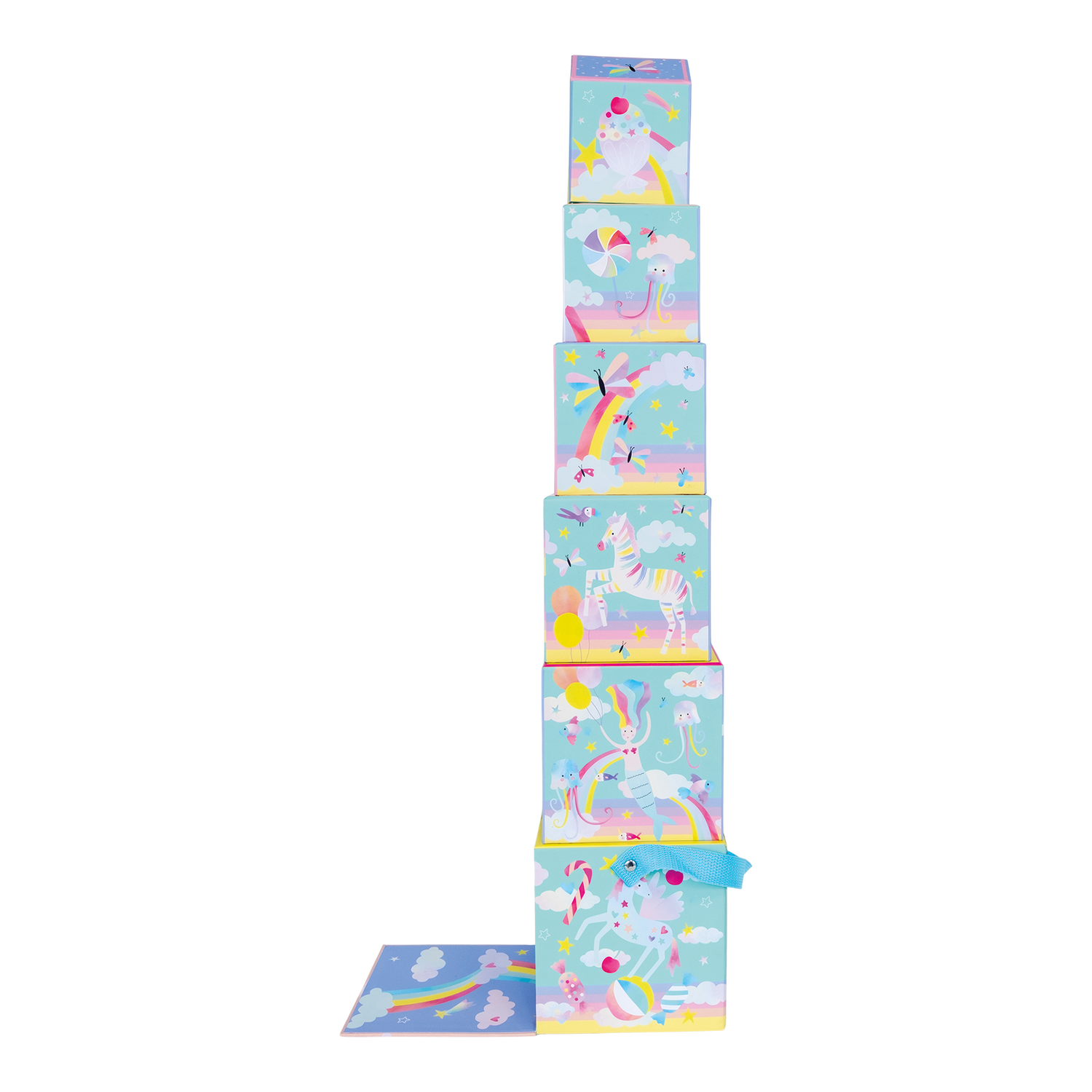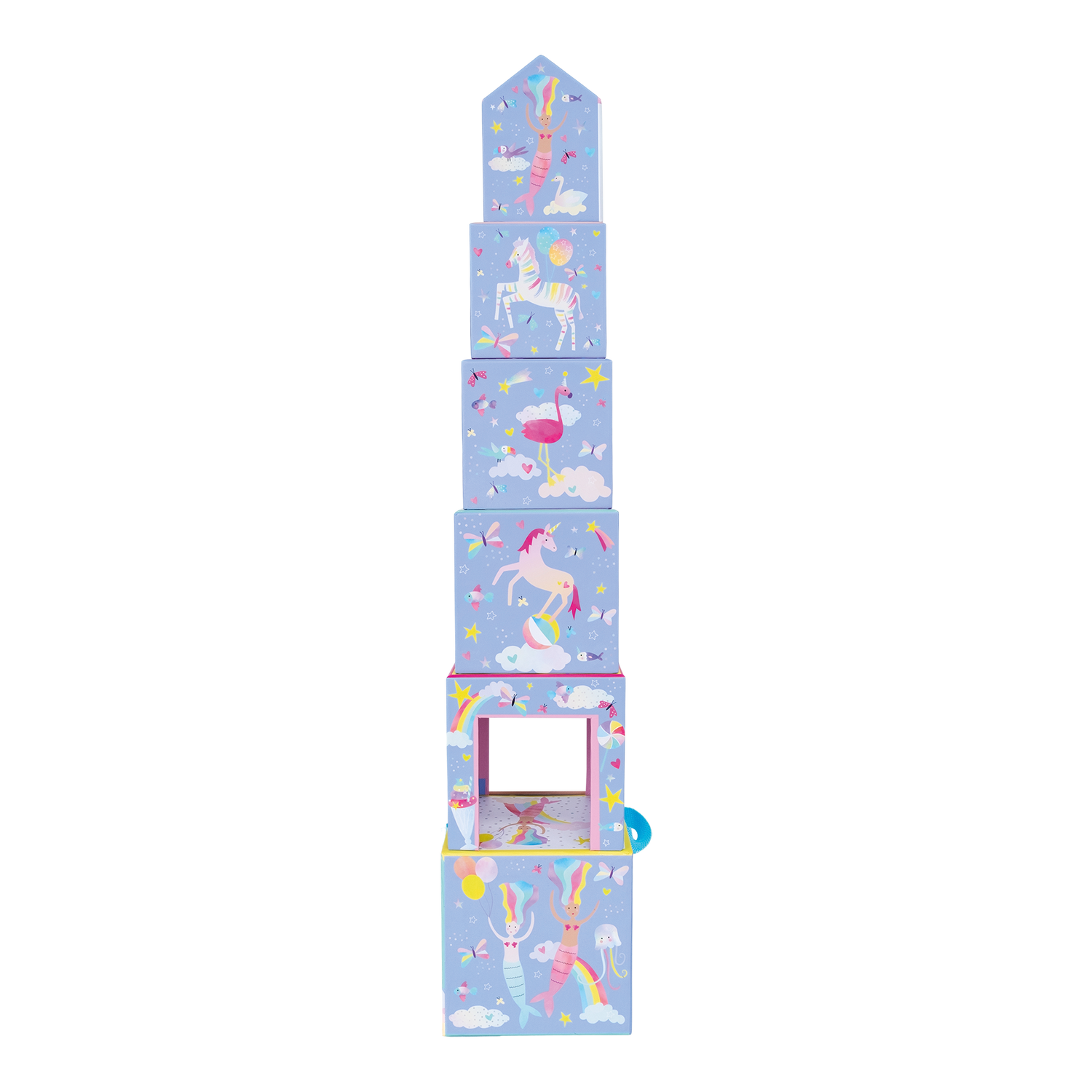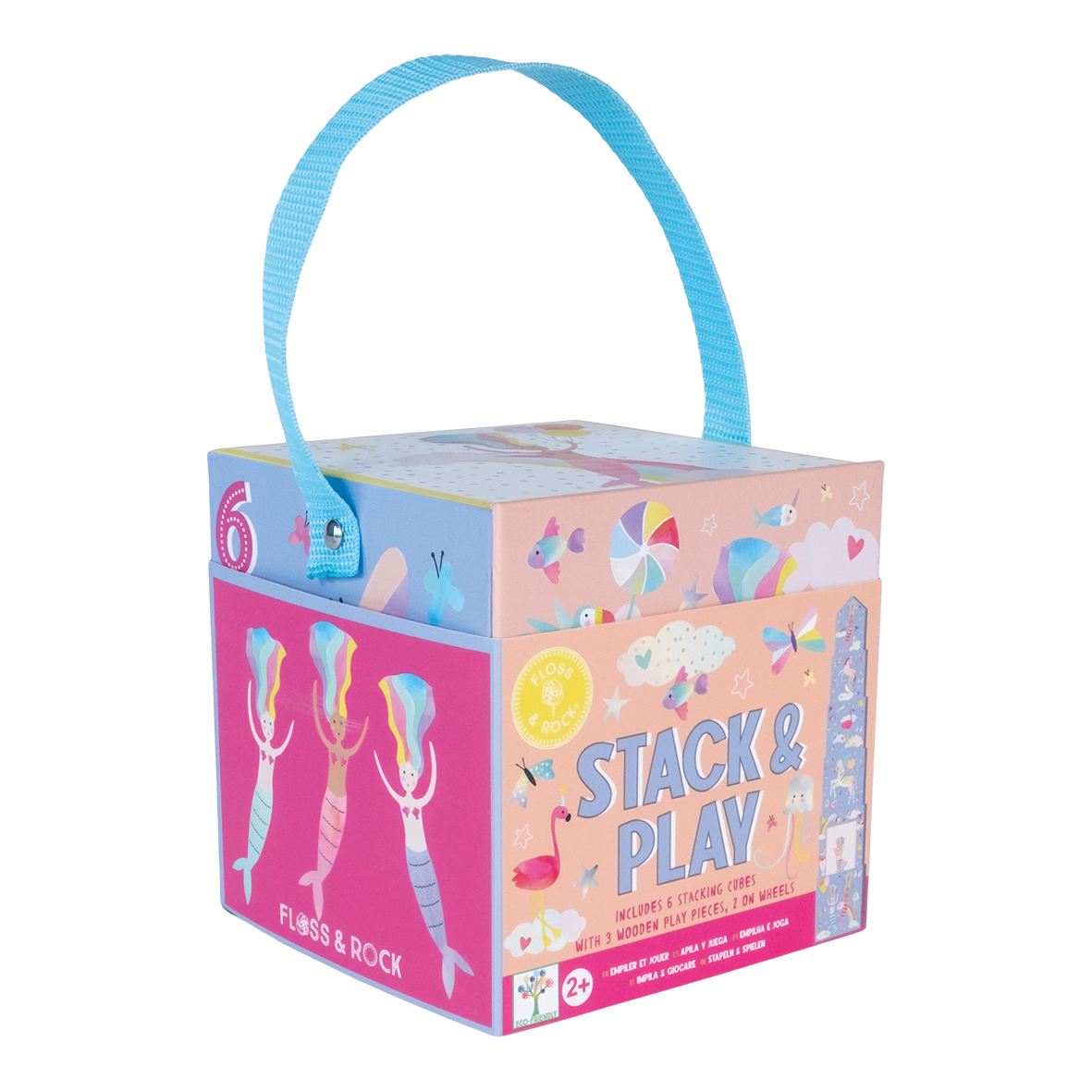 Get ready for endless amounts of fun with Stack & Play. Make a tower, then hide and play using the wooden pieces. Count the numbers on one side, then match up the scenes on the other (either by stacking or laying them side by side). The fabulous Fantasy design features mermaids, unicorns, fish, rainbows and more. Stack & Play includes 6 stacking cubes, 3 wooden play pieces, 2 on wheels. All parts are stored in the biggest box with a handy carry handle, making it so easy to take around with you!