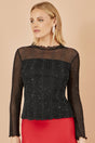 Yumi Black Sparkle Print Mesh Stretch Fitted Top