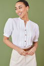 This lightweight cotton shirt will be your go to for everyday in the sunshine. With pleated details in the front, cute little button fastening and a puffed short sleeve to complete the look. We love this styled casually with denim and trainers.