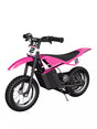 Introduce young riders to the excitement of off-road adventures with the Razor MX125 electric motocross bike, presented here in a vibrant pink finish. This bike is specifically designed as Razor's smallest electric dirt bike, scaled down for riders aged 7 years and older. It features authentic motocross frame geometry, providing a realistic look and feel while ensuring stability for younger enthusiasts learning the basics. Powered by a chain-driven motor and a 12-volt rechargeable battery system, the MX125 reaches manageable speeds of up to 8 mph (13 km/h), offering safe yet thrilling fun for up to 40 minutes on a single charge.
