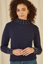 Ditch the jewellery for embellished knitwear! This gorgeous Navy number is the perfect everyday jumper for work or weekend. With a high collar filled with a delicate pearl detail, that is matched on the cuffs. This super soft lightweight sweater looks perfect paired with jeans and trainers.
