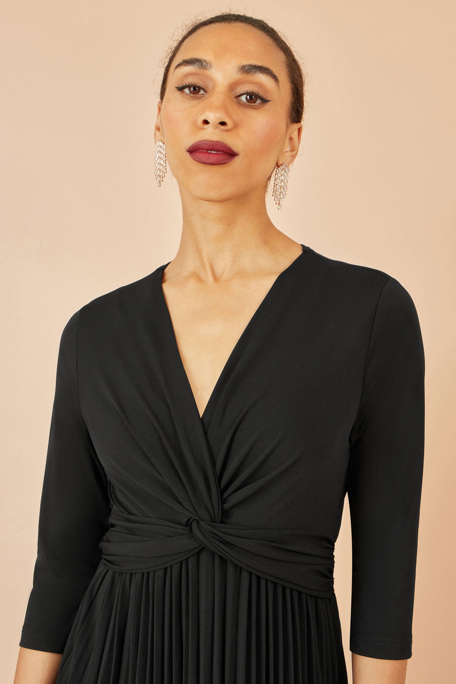 Yumi Black Jersey Knot Waist Pleated Midi Dress