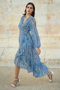Yumi Blue Paisley Dipped Hemline Midi Dress With Open Long Sleeves - Blue / 8 is backordered and will ship as soon as it is back in stock.