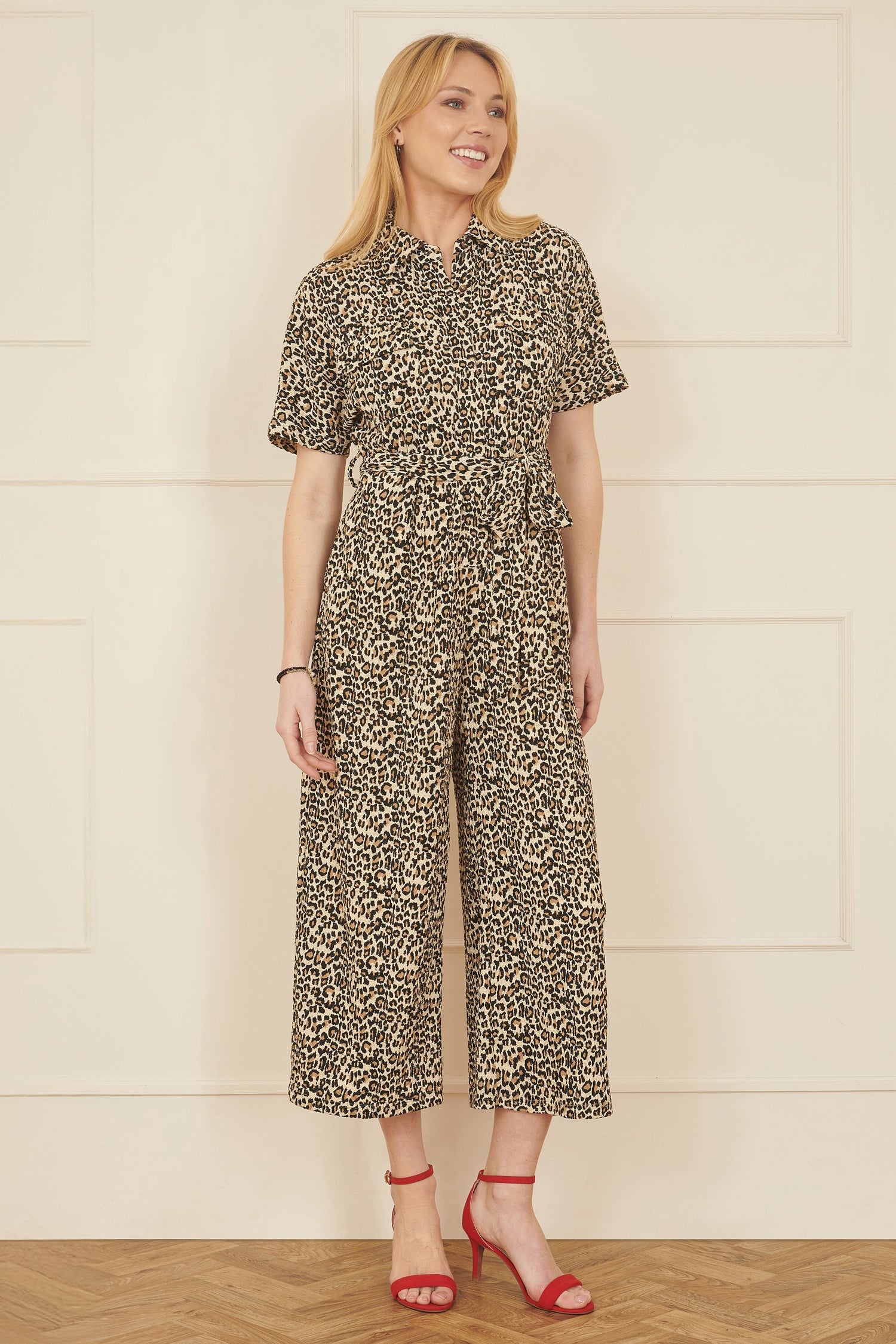 Style meets safari in this cute button down jumpsuit. With all over mini leopard print that is bang on trend and perfect for the changing seasons. With looks super stylish with boots and a bomber jacket for the cooler weather or switch to sandals in the summer, The wide leg design is framed with a tie belt at the waist for a flattering fit.