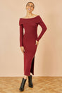 Yumi Burgundy Bardot Knitted Fitted Midi Dress