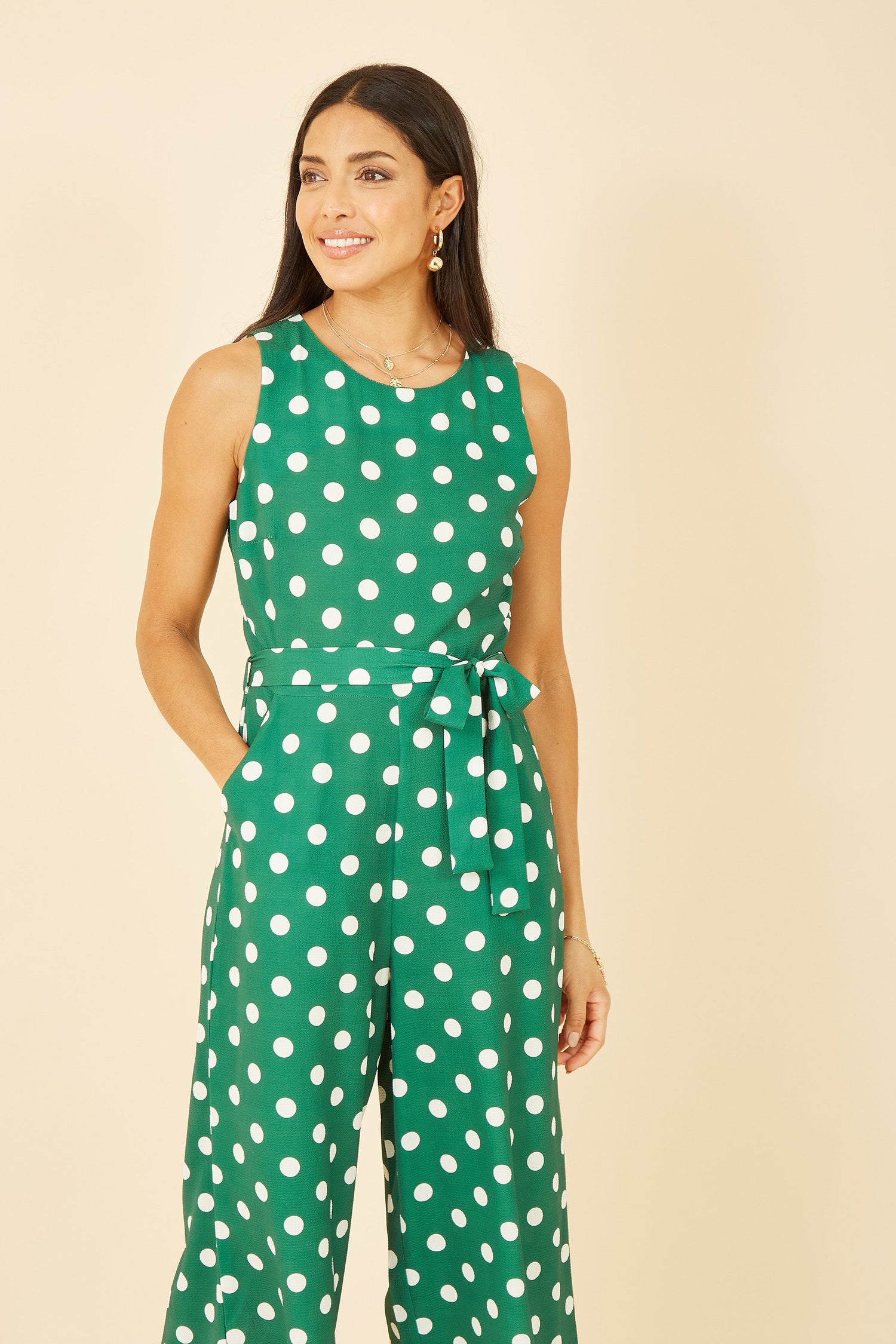 This sleeveless Yumi Polka Dot Culotte Jumpsuit can be styled up or down. Think workwear, evening wear, a cool and casual day time fit - this piece really does do it all. With a flattering and classic Green and white polka dot design, a sleeveless finish and a cinched, it's hard not to look your best. Add statement hoops and go.