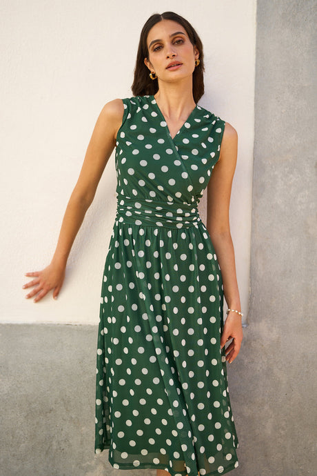 Yumi Green Polka Dot Mesh Wrap Skater Dress With Pockets