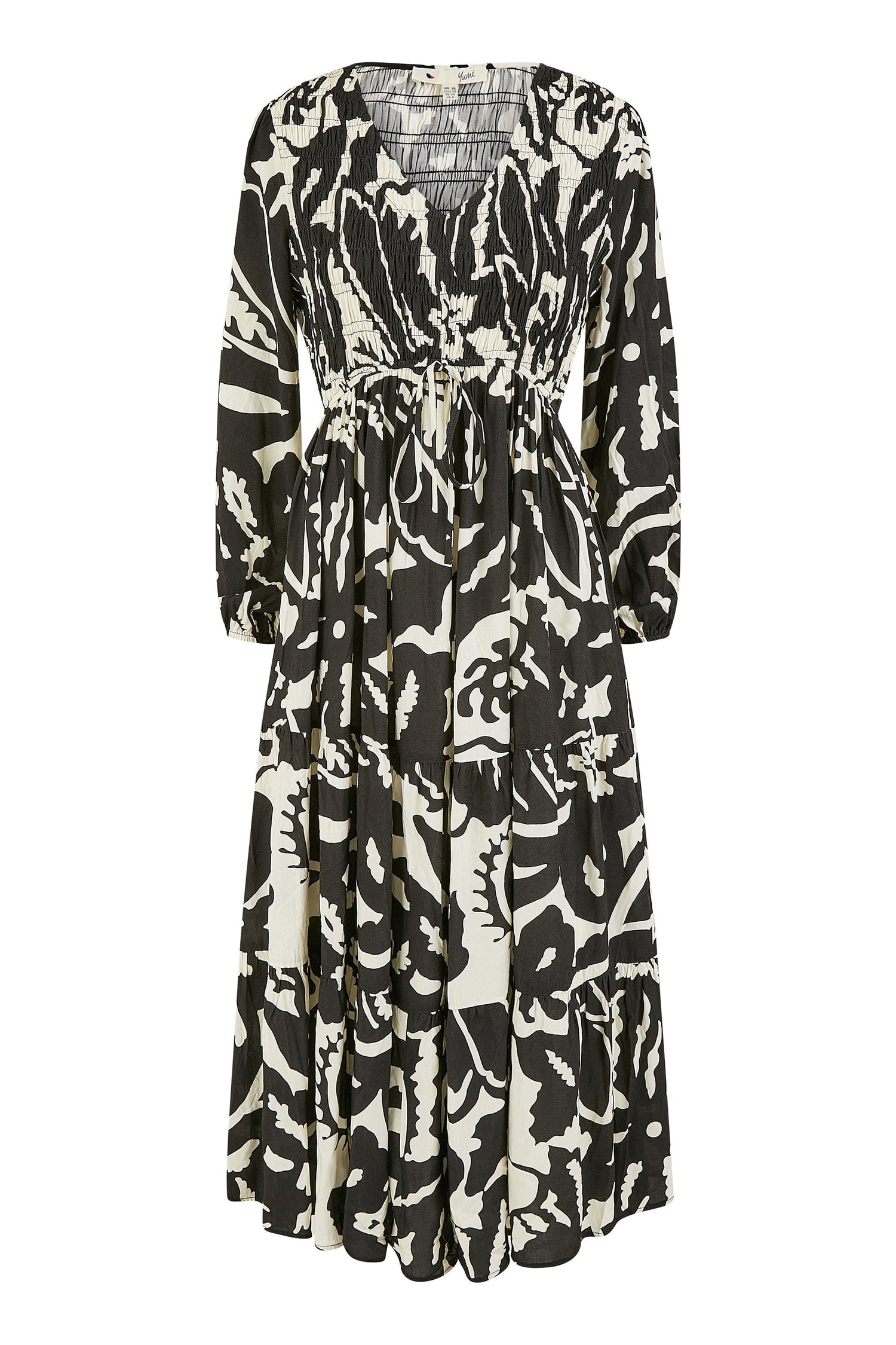 Perfect for the changing seasons this rayon dress feels great. With long sleeves, a ruched design bodice that can be cinched at the waist and midi length hemline that is tiered. Think boho chic with the large abstract print. Pair with a fluffy gilet and boots for a cool fit.