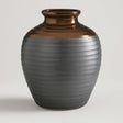 Skilfully handcrafted, the coppershaded surface is enhanced by the warm metallic detail around the neck of this vase. This large ceramic vase creates a rustic appeal to a variety of abodes and the horizontal lines add a geometric accent.