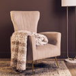 This mink velvet accent chair exudes elegance with its vertical channel tufting on the backrest and seat. The arms slope inwards, adding style and comfort. The winged backrest and slanted legs give the chair a captivating visual appeal.
